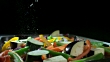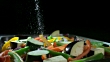 Slow motion shot of salt being sprinkled over a pan of chopped vegetables. - HD stock video