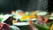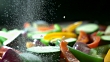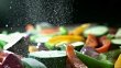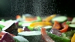 Slow motion shot of salt being sprinkled over a pan of chopped vegetables. - HD stock video
