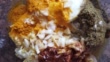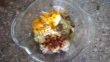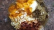 Slow motion POV stabilized handheld shot of mixing, preparation and cooking of chicken biryani- a glass bowl with turmeric, curd, chicken, lemon juice and paprika red - 4K stock video