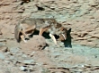 WWWA: COYOTE!: TU WS Small mountain ZI WS Coyote sitting under rock ledge. WS Coyote walking on side of mountain over rocks on narrow path, food in mouth.