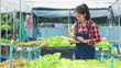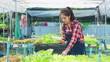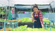 Smiling asian woman smart farmer using digital tablet to control and check hydroponic system for vegetable salad farm in greenhouse, small business owner using technology for manage farm.