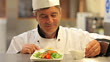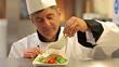 Smiling chef pouring dressing over salmon and salad dish and presenting