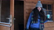 Smiling woman coming out of mountain hut in the winter. - 4K stock video
