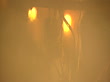 Smoke rises from a glass bell jar hanging from rope as torches burn in the background. - stock video