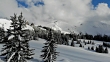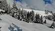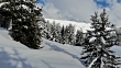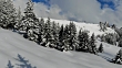 4K aerial shot through snow covered pine trees in the French Alps. Avoriaz village in background.
