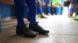Soccer player tying shoelace before a match in the locker room - 4K stock video