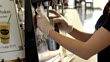 CU PAN soda fountain worker with milk shake mixer machine gently rotates chrome cup while making milk shake / Rancho Mirage, California, USA - HD stock video