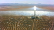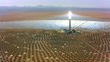 Aerial shot of the solar tower lit by the mirrors at Crescent Dunes Solar Energy powerplant near Tonopah, Nevada. Shot in USA.