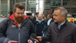 ARMED FORCES: Soldier injured in Iraq completes challenge to walk 2012 miles around Britain; ENGLAND: London: Canary Wharf:EXTReporter to camera Major Phil Packer interview with reporter in shot SOTCUTAWAYSLow angle view Packer walkingBen Parkinson (Injured Paratrooper) interview SOT