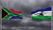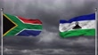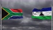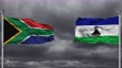 South Africa And Lesotho Flags Are Waving Against Each Other On A Closed Cloudy Sky And Lightning Strikes Between Two Flags.