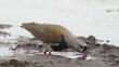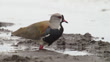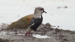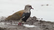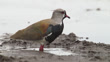 A Southern lapwing (Vanellus chilensis) stands at the waters edge and dips it's beak in the mud as it forages for food. Chile, Patagonia. (FKAD027Y - Clip taken from programme rushes - 21944).