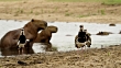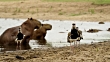 Southern lapwings (Vanellus chilensis) stand in mud as capybara (Hydrochoerus hydrochaeris) sit in water. (Core Number: FKAY491X)