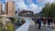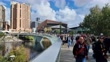 ADELAIDE, AUSTRALIA - APRIL 15: Spectators walk over the Riverbank Precinct Pedestrian Bridge to Adelaide Oval for the round five AFL double header between the Essendon Bombers and Melbourne Demons followed by the Port Adelaide Power and Western Bulldogs, on April 15, 2023, in Adelaide, Australia. (Footage by Paul Kane/Getty Images)
