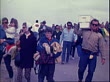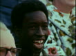 Spectators walking down slight hill, passing camera, arriving at Indianapolis Motor Speedway, many carry coolers, lawn chairs / dunelike mountains in distance / crowd in spectator stands, many getting to feet for better view / redheaded woman eating Nutty Buddy ice cream cone, watching race / CU boy watching race, making faces / CUs teenage black and white men watching race, reacting, making faces / CU young man sporting thick black rim glasses, think mustache, shaggy hair / boy wearing US Army jacket watching race / Hispanic man watching race / two African American teenage boys watching race, smiling / CU young woman watching race / Latino boy watching race / CU woman chewing gum, watching race / young man watching race, flashing peace sign at camera / Crowd, spectators, sporting events. 1970 Indianapolis 500 on May 30, 1970 in Indianapolis, Indiana (Footage by Getty Images)