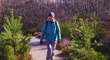 Woman hiking a long distance trail called the Speyside Way which follows trails and old railway track along the course of the River Spey from Buckie to Newtonmore in the Highlands of Scotland. Part of a series, this section is north of Kincraig at a notably undulating area of young Scots Pine trees. Original capture in 6K.
