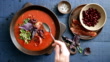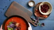 Spicy tomato, bean, herb and fried bacon soup on dark blue background