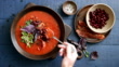 Spicy tomato, bean, herb and fried bacon soup - HD stock video