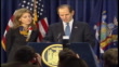 MS Spitzer at podium with wife at his side