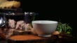 Serving soul-warming ham bone split pea soup with bacon and thyme. Soup bowl containing ham bones before pouring soup