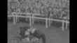 Title: "Sports - U.S. Colt Wins Ancient St. Leger" superimposed over race / WS crowds at Doncaster / WS horse parade / #7 Never Day Die, race horse, parading / MS crowd / WS start of race / VS Follow horses running at far side of course / CU man looking thru binoculars / WS horses round last turn into straightaway / CU another man looking thru binoculars / LS horses along straightaway with Never Say Die way out ahead, passes finish post, jockey turns around to see where the rest of the field is / MS Charles (Charlie) Smirke, English jockey, dismounts, crowd in background