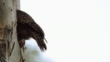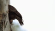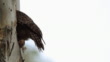 Spotted broad winged hawk tail feathers stick out as it looks in a tree hollow in daylight. Handheld. Mid Shot.