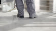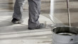 Spreading protective liquid resin layer on cement floor with spatula on rod