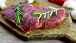 Sprinkling spices on raw piece of meat beef on wooden cutting board with rosemary and vegetables - HD stock video