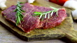 Sprinkling spices on raw piece of meat beef on wooden cutting board with rosemary and vegetables. Meat cooking concept. Close-up. Selective soft focus. Shallow depth of field. Text copy space.