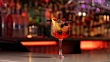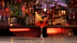 Front view of a Spritz cocktail on a bar counter. The background of the image is defocused lights and the back of the bar. This cocktail has blackberries and raspberries as a garnish on the cold drink.