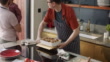CS, Stabilized Handheld, tilt up - Homosexual couple in kitchen with daughter making casserole - 4K stock video