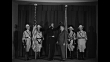 Standing on stage, old Commander Edward Scheiberling (on left) shakes hands with new Commander John Stelle, men standing on either side of them holding US flag and other flag on poles; the two commanders exchange hats and stand for photo opportunity