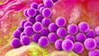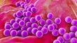 Animation of a colony of Staphylococcus bacteria. These are spherical gram-positive bacteria that form an important part of the microbiome of humans and other animals, particularly on the skin and in the upper respiratory tract. In some cases they can cause opportunistic infections, such as abscesses, sinusitis and food poisoning. The strain methicillin-resistant Staphylococcus aureus (MRSA) is an important drug-resistant pathogen (or 'superbug'). It causes infections particularly in hospitals, prisons and other enclosed environments. It is difficult to treat with antibiotics and infections can be fatal