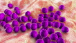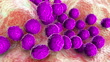 Animation of a colony of Staphylococcus bacteria. These are spherical gram-positive bacteria that form an important part of the microbiome of humans and other animals, particularly on the skin and in the upper respiratory tract. In some cases they can cause opportunistic infections, such as abscesses, sinusitis and food poisoning. The strain methicillin-resistant Staphylococcus aureus (MRSA) is an important drug-resistant pathogen (or "superbug"). It causes infections particularly in hospitals, prisons and other enclosed environments. It is difficult to treat with antibiotics and infections can be fatal