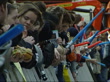 SIDE MS Line of people standing behind barrier outside cinema as awaiting premiere of Star Wars Attack of the Clones TRACK FORWARD
