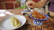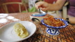 Start eating, stir, the side dishes of Khao Cha, Fried minced pork and Salted Fish-eating with ice violet rice, color from nature, butterfly pea flower, traditional Thai food in the summer. - 4K stock video