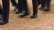 State visit by Indian President Pratibha Patil: March Past at Windsor Castle; Royal Guards (wearing bearskins hats and red uniforms) marching past with guns as band plays / Queen and Pratibha Patil along through quadrangle followed by Dr Devisingh Ransingh Shekhawat (Patil's husband) and Prince Philip (Duke of Edinburgh), then Camilla and Prince Charles
