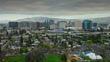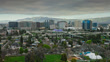 Aerial establishing shot of Junipero Serra and Guadalupe freeway interchange overlooking Market - Almaden, a neighborhood in San Jose, Santa Clara County, California