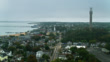 Aerial establishing shot of Provincetown, Massachusetts on a foggy overcast morning
