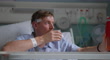 Static selective focus shot of a man in a hospital bed having a brain study done to investigate his sleep seizures. He is staying at a medical establishment in the North East of England and has multiple electrodes monitoring his scalp. He pours himself a glass of carbonated orange juice before drinking from the glass, looking away from the camera with a bored expression. Images are available similar to this scenario.