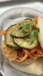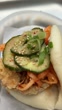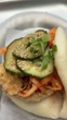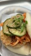 Steamed bao bun filled with crispy fried chicken, kimchi, and cucumber