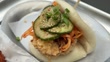 Steamed bao bun filled with crispy fried chicken, kimchi, and cucumber