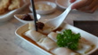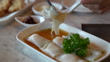 A person using chopsticks to pick up a freshly steamed rice noodle roll "Chee Cheong Fun" at a dim sum restaurant. Served with soy sauce and garnished with parsley.