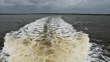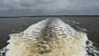 Stern view of churning prop wash and boat wake with cloudy skies and islands on the orizon. Footage shot in the Cumberland island area of southeast Georgia