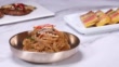 Stir-fried Korean Chili Peppers and Pork (or Japchae, Korea Traditional Festival foods) on the table - 4K stock video