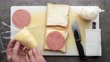 A processed white bread sandwich constructed with bologna meat slices, processed cheddar cheese slices wrapped in plastic, and mayonnaise on a plastic chopping board. Shot from directly above. Conceptual video of preparing a very unhealthy processed fast food sandwich.