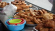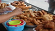 Close-up of a street food vendor’s hands handling money while selling assorted fried snacks at a market stall.