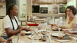 Diverse businesspeople sitting at dining table in cooking classroom with senior instructor and enjoying dishes prepared during team building event.