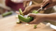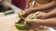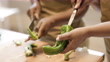 Close-up of women standing at cutting board slicing and cleaning seeds out of peppers in preparation for making gazpacho.