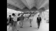 Students using covered walkways in the Plaza Cubierta on the mid-century Ciudad Universitaria de Caracas (CUC, University City of Caracas), the main campus of the Universidad Central de Venezuela (UCV, Central University of Venezuela). Includes shot of a student pacing back and forth whilst reading near a perforated concrete screen, and young men walking towards camera under a wavy shelter. Caracas, Venezuela; 1963. (LCA4031J - AEVZ001J)