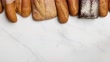 Successive stop-motion appearance of different types of bread on a white marble background - 4K stock video